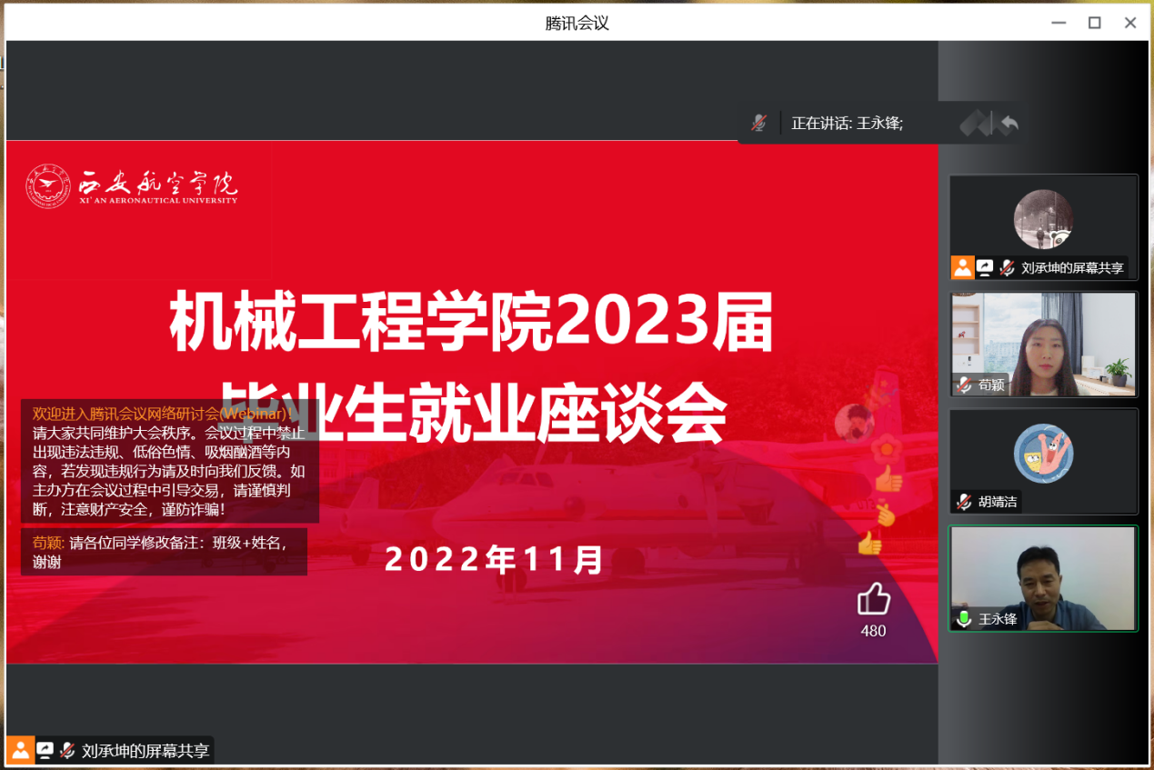 为进一步促进金年会官网毕业生就业工作,提升毕业生求职就业的积极性和主动性,为毕业生就业提供有针对性地帮扶和指导,11月10日晚7点,金年会jinnianhuicom召开2023届毕业生就业座谈会,金年会jinnianhuicom院长王永锋、2023届毕业生参会,毕业班辅导员苟颖主持。