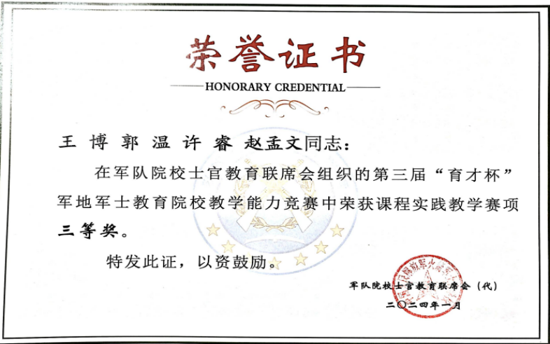 该项赛事分为公共基础课程教学、专业课程理论教学、专业课程实践教学三个赛项,全国55支教学团队参赛,历经课堂说课、课堂授课、教案等环节,专家现场打分环节,最终金年会官网教学团队在此次竞赛中获得三等奖,充分展现了教师队伍建设成果和个人教学能力水平。通过参加全国军地院校教员教学能力比武竞赛活动,进一步增进校际交流,深化教学改革,更新教学理念,推进课程思政,创新教学方法,激发队伍活力,打造高水平教学团队和高质量示范课程,促进金年会官网军士生教学质量提升。