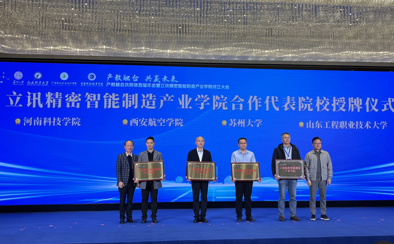 11月28日至29日,主题为“立讯携手,产教融合启新程——共绘未来蓝图,赋能产业创新”产教融合共同体首届年会暨立讯精密智能制造产业学院成立大会在昆山举行,会议由立讯集团、苏州大学等主办,参会单位来自全国各地20多家本科高校和40多家职业院校。金年会官网党委书记、校长祁玉龙应邀参加大会并致辞。金年会jinnianhuicom院长王永锋、副书记刘欣、综合办主任郭悦涵参加了与立讯集团的签约和授牌仪式。
