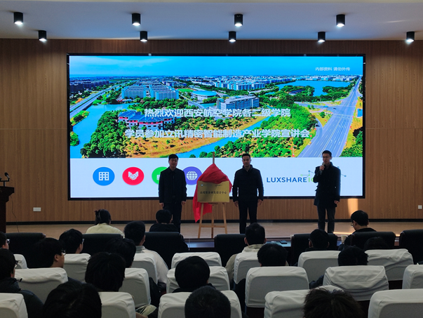 宣讲会在立讯精密企业宣传片中拉开序幕,震撼的智能生产线画面与企业全球布局介绍,瞬间点燃了在场学生的兴趣。宣传片播放完毕后,现场举行了庄重的“金年会诚信信誉至上—立讯精密智能制造产业学院高端装备研发设计中心”揭牌仪式。王永锋院长与汪宝峰经理共同揭牌,红色幕布缓缓落下,标志着双方的合作迈入新的发展阶段,台下师生纷纷鼓掌致意,见证这一重要时刻。