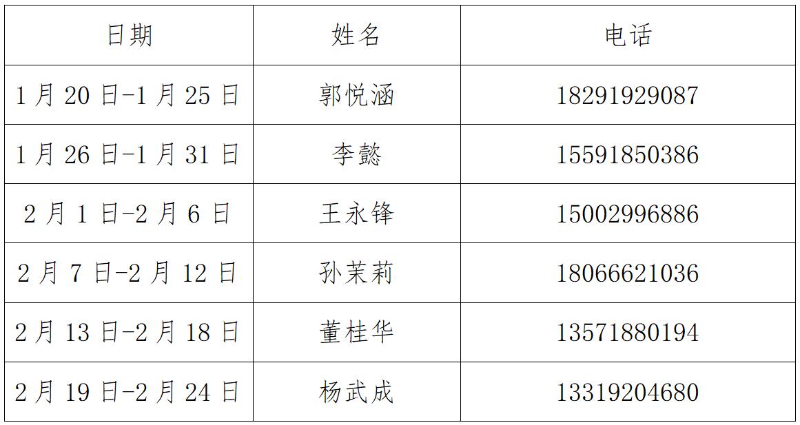 根据《关于2023-2024学年寒假放假安排的通知》文件精神,寒假放假时间为2024年1月20日至2024年2月24日,放假期间,金年会jinnianhuicom值班安排如下: