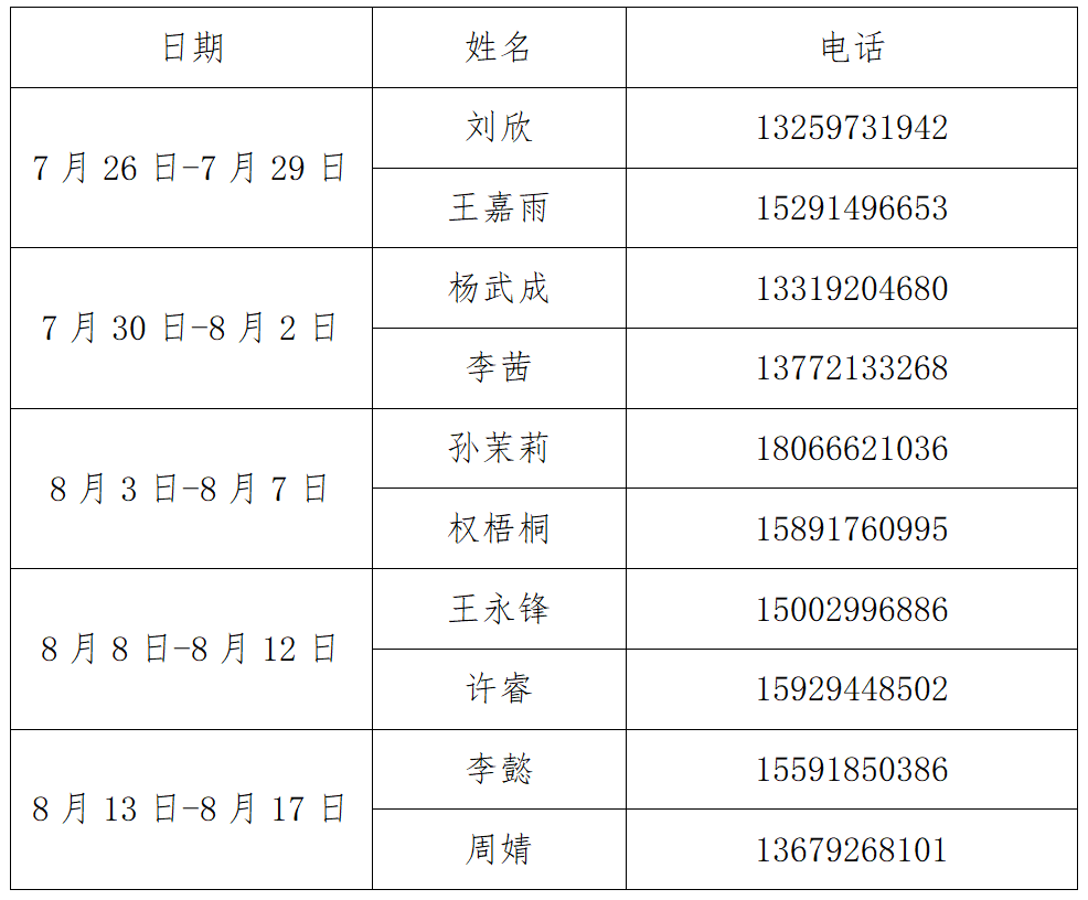 根据学校《关于2025年暑期放假安排的通知》文件精神,教职工放假时间为7月26日至8月17日,放假期间,金年会jinnianhuicom值班安排如下: