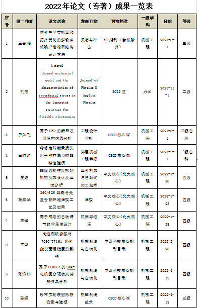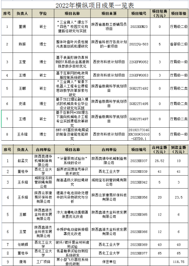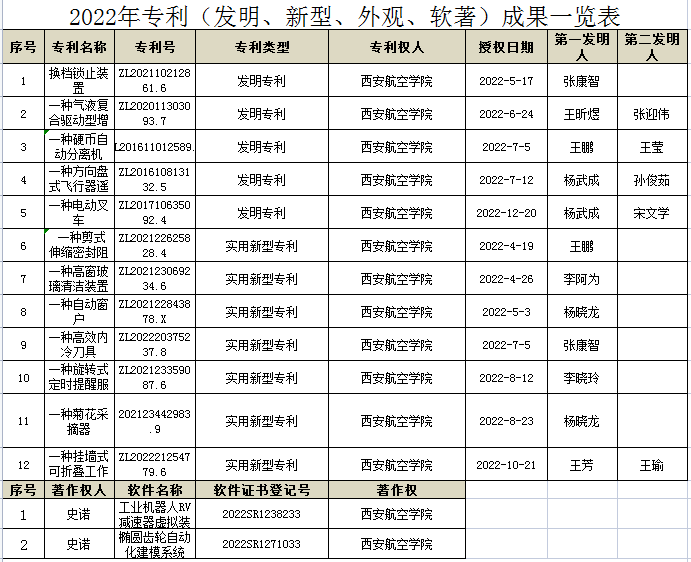 金年会jinnianhuicom在校级科研平台——机电技术研究所的基础上,成立 6个科研团队:高端数控装备创新研发团队、工业机器人末端执行器设计及控制技术应用科研团队、航空材料力学性能分析与表征科研团队、航空先进制造系统集成及其自动化科研团队、航空液压装备设计与测试科研团队、新质装备技术及应用科研团队。2022 年金年会jinnianhuicom积极申报各类项目 41 余项,获 4批陕西省科技厅项目 1 项、西安市科技局 2 项,校级基金立项 8 项; 纵向项目到款 10.5 万元;结题 6 项,其中国家级 1 项,厅局级 3 项, 校级 2 项;横向项目:签订横向课题 13 项,合同金额 384.02 万元, 到款额 313.25 万元;其他:发表各类学术论文 10 篇,其中 SCI 1 篇, CSCD 检索 2 篇,核心论文 15 篇,普刊 1 篇;授权发明专利 5 件、实用新型专利 8 件。