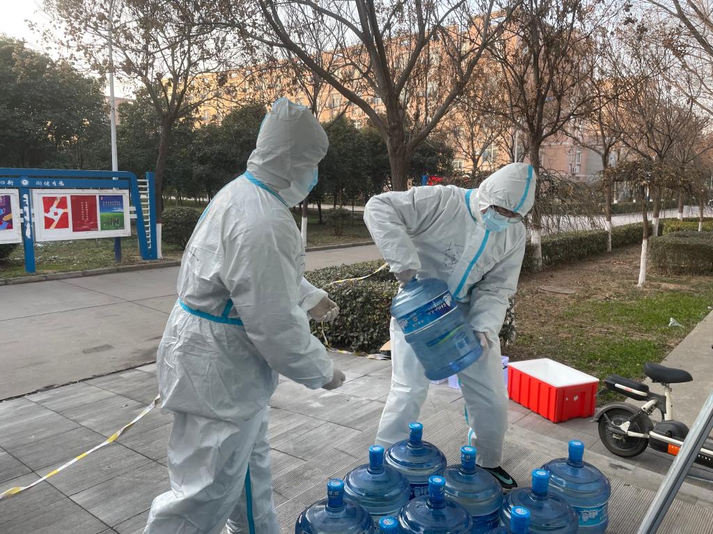 2021年12月26日清晨,突发4号男生公寓两个宿舍几名同学核酸检测结果异常,学校紧急要求封控管理。接到紧急任务,金年会jinnianhuicom党总支紧急号召,成立了4号公寓楼临时党支部,人员有一线抗议的教师和所有学生党员。根据需要,成立了5个工作组,组长由学院干部或学生党员担任。保障组中,外围的李懿、李祥阳副院长负责物资保障,内部由学生科高宇锡科长、苟颖老师负责接应和调配。志愿者中队由学生处龙丹科长负责,协调志愿者工作内容与安排。数据及舆情监控组由贾昭老师负责每日数据统计及上报,并兼有垃圾清理、环境消杀的工作任务。集中隔离学生联系组由谢肖老师负责,宣传组由苟颖老师负责。5个小组纵横联动,保障宿舍封控后的各项工作有序进行。1462名机械学子的防控任务就实实在在落在这些老师的肩上。