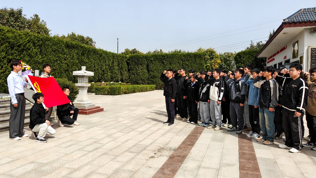 在庄严肃穆的阎良烈士纪念碑和中国飞行试验研究院烈士公墓前,全体师生整齐列队,肃立默哀,向革命先烈致以崇高敬意。王鹏博老师带领学生党员重温入党誓词,铮铮誓言在陵园内回荡,表达了师生们继承先烈遗志、永葆政治本色的坚定决心。