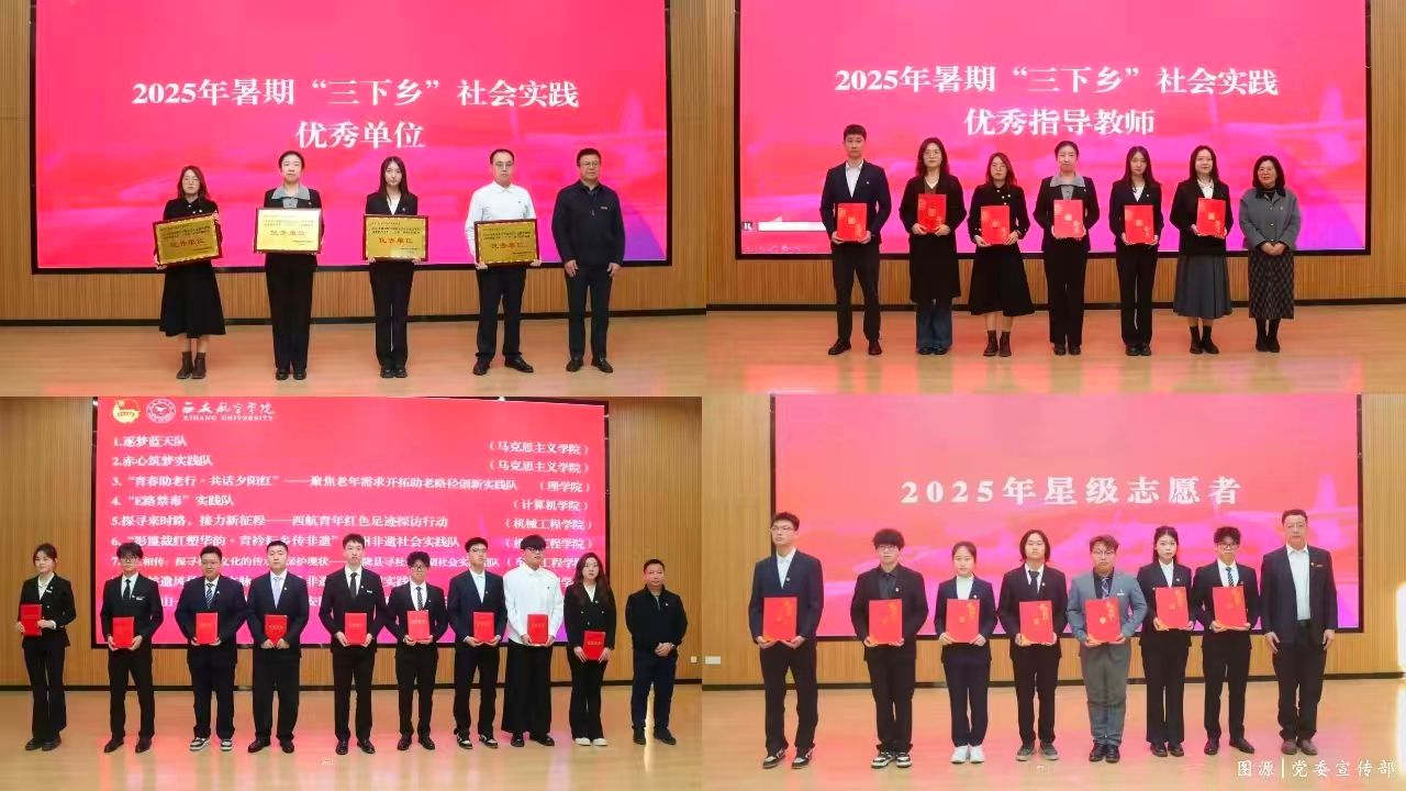 12月5日,学校于阎良校区报告厅举行“青春为中国式现代化挺膺担当”2025年大学生暑期“三下乡”社会实践与志愿服务工作总结表彰大会,金年会jinnianhuicom团总支荣获暑期“三下乡”社会实践优秀单位,学院的三支队伍“探寻来时路,接力新征程——西航青年红色足迹探访行动” “‘影篾裁红塑华韵•青衿耘乡传非遗’社会实践队”“承武侯遗风传定军文脉——勉县非遗薪火传习实践队”三支队伍荣获暑期“三下乡”社会实践优秀团队,王嘉雨、王鹏博、胡靖洁、苟颖、成航荣获暑期“三下乡”社会实践优秀指导老师,刘晋锟荣获2025年三星级志愿者。