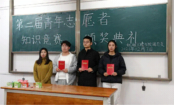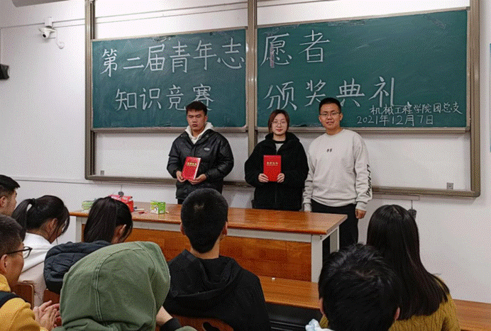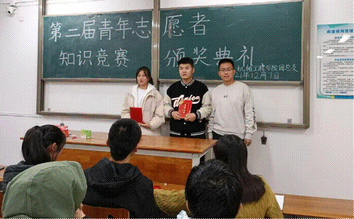 12月7日晚18:30,金年会官网第二届青年志愿者知识竞赛颁奖典礼在阎教楼1434隆重召开。团总支书记苟颖老师和大一年级辅导员谢肖老师出席此次活动,青年志愿者中队队长邹梦祺主持。