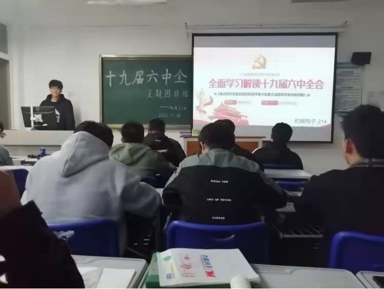 活动以各班级为单位展开,与会同学观看学习了《中国共产党第十九届中央委员会第六次全体会议公报》,各团支书通过PPT的形式向大家展示党的十九届六中全会精神的学习重点,旨在深入学习党的十九届六中全会精神,进一步增强同学们的国家观念,弘扬爱国主义精神。学习结束后,同学们积极讨论,并写下了个人心得。