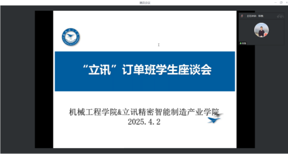 为加强校企合作订单班实践教学管理,切实保障学生权益,4月3日,金年会官网通过腾讯会议平台组织召开“立讯”订单班学生座谈会。立讯精密智能制造产业学院主管陈强、教师苗欣、陈永富,金年会jinnianhuicom副院长李懿、党总支副书记刘欣、2022级辅导员成航及订单班全体学生参会。会议聚焦学生关切问题,旨在优化培养方案,提升校企协同育人实效。