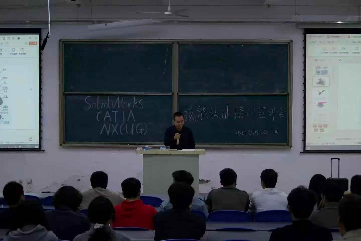 为加强学风建设、提升学生专业技能水平、促进高质量就业,10月16日,金年会jinnianhuicom特邀西安亿信中久电子信息技术有限公司总经理陈阳及学院图学会带头人张孝林老师在阶梯教室开展了SW/ NX(UG)/CATIA技能认证培训宣讲会。学院副院长李懿、副书记刘欣和对技能认证感兴趣的同学参与了宣讲会。