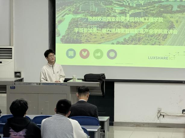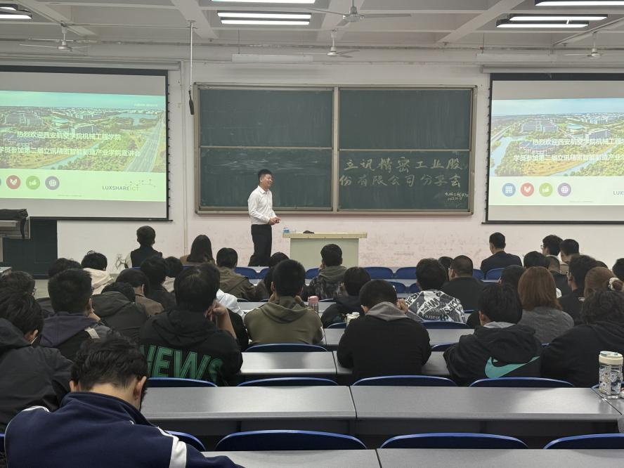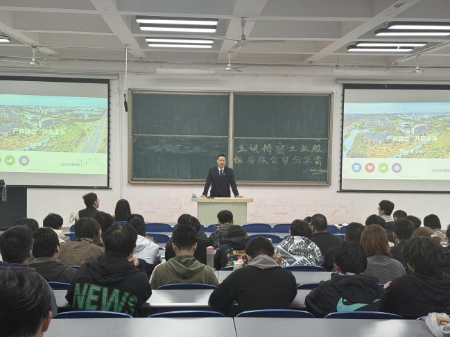 随后,立讯精密汪宝峰进一步补充介绍企业发展历程、核心业务领域及智能制造产业布局,重点分享企业在精密制造、自动化技术研发等方面的优势成果。同时对同学们关心的产业学院报名条件、课程设置与专业课程的衔接、企业实习的时间安排与安全保障、实习期间的补贴标准以及毕业后能否优先进入立讯精密核心技术部门工作等问题进行了耐心细致的解答。