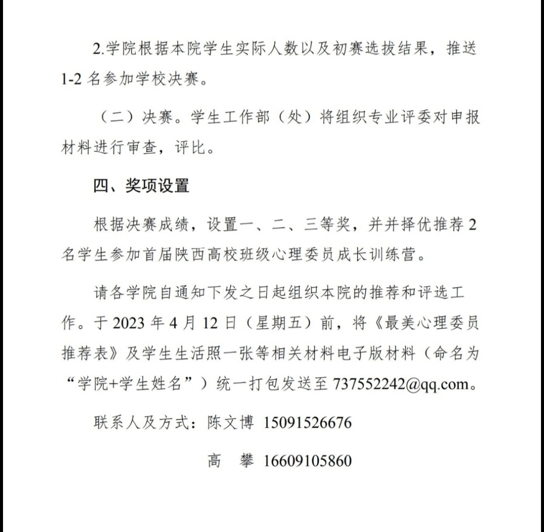 请有意向参加此次活动的班级心理委员,于2024年4月12日前将《最美心理委推荐表》及学生生活照一张等相关材料电子版材料(命名为“学院+学生姓名”)统一打包发送至737552242@qq.com。(文/胡靖洁 图/胡靖洁 审核/孙茉莉)
