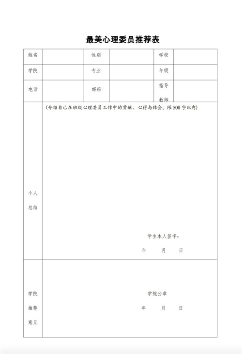 请有意向参加此次活动的班级心理委员,于2024年4月12日前将《最美心理委推荐表》及学生生活照一张等相关材料电子版材料(命名为“学院+学生姓名”)统一打包发送至737552242@qq.com。(文/胡靖洁 图/胡靖洁 审核/孙茉莉)