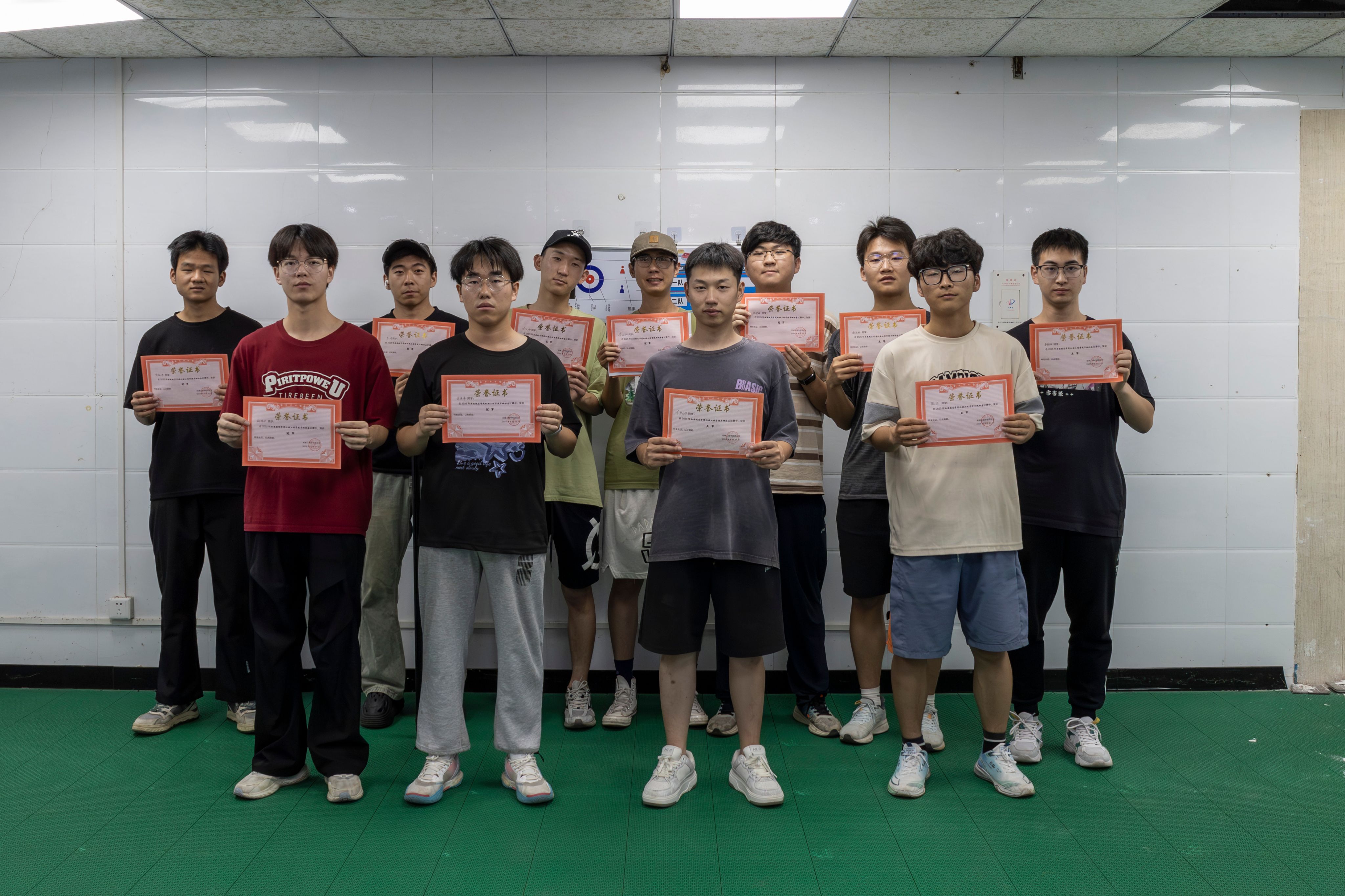 而冠军赛更是将比赛氛围推向了高潮,G队与 B队狭路相逢,展开了激烈的巅峰对决。比赛一开始,双方就迅速进入状态,比分交替上升,难分高下。最后一局,比赛进入白热化阶段,全场观众都屏住呼吸,紧张地注视着赛场。此时,“B队” 队员小Z顶住巨大压力,冷静调整呼吸与姿势,然后果断出手,一记精准推壶,冰壶沿着理想的轨迹稳稳前行,成功锁定胜局。“B队” 队员们激动地欢呼拥抱,共同庆祝这份来之不易的荣耀。赛后,部长亲自为获奖队伍颁发了奖杯与证书,向他们表示热烈的祝贺,肯定了他们在赛场上的精彩表现和拼搏精神。