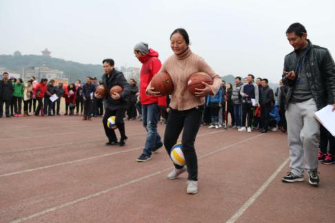 接力赛后紧接着是爱心传递,此项目是对团队协作与速度的考验,老师们俯下身躯,团队合作,球在手中灵活自如。在随后妙趣横生的企鹅漫步项目中,运动员两臂间夹两排球,双腿夹一篮球,老师们夹着球在速度中寻求平衡,摇摇晃晃向终点走去,他们如企鹅般可爱的模样逗乐了现场的观众。而在最后的同心协力项目中,运动员们手挽手,脚绑脚,默契配合,拼尽全力,喊着“一二一“的口号”向终点冲刺,学院最终取得小组第二的好成绩。