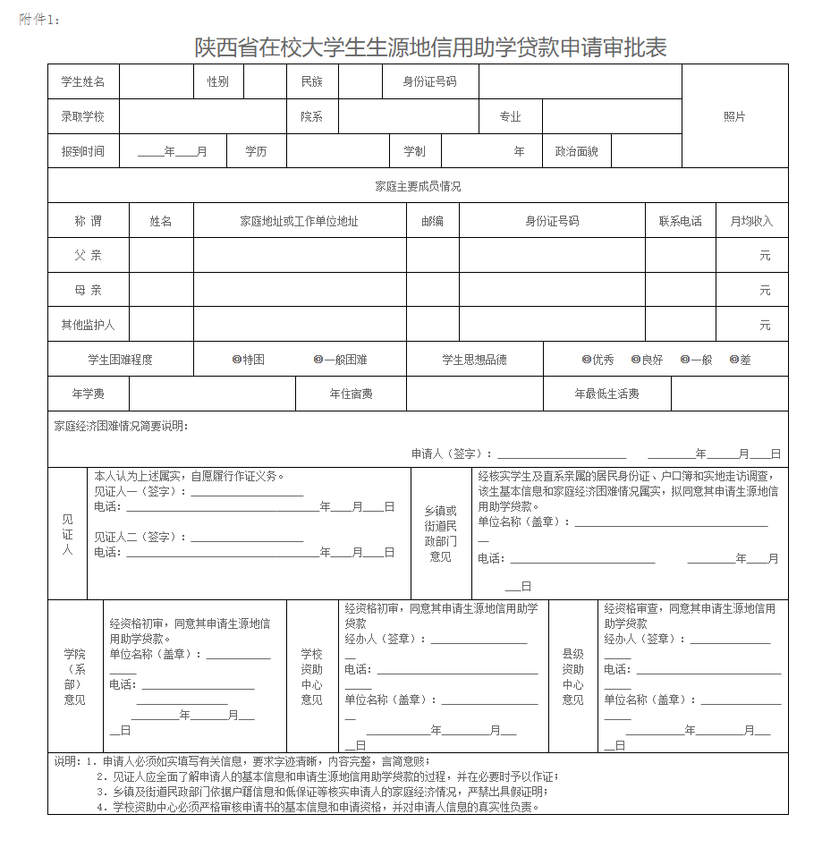 1.陕西省在校大学生生源地信用助学贷款申请审批表